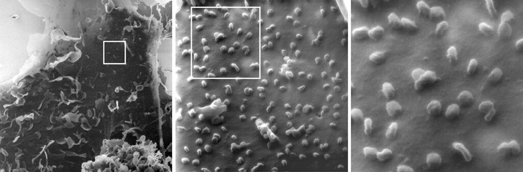 In ihrer Studie haben die Wissenschaftler*innen Zellen, die künstlich aus dem Nierengewebe einer Affenart gewonnen werden, mit SARS-CoV-2 infiziert und im toten Zustand mikroskopiert. „Unsere Aufnahmen ermöglichen einen direkten Blick auf die 3D-Oberfläche der Coronaviren und der Nierenzelle – mit einer Auflösung im Bereich weniger Nanometer“, sagt Frese. Dadurch konnten die Forschenden Interaktionen zwischen den Viren und der Nierenzelle sichtbar machen. Ihre Studienergebnisse weisen etwa darauf hin, dass sich mit dem Heliumionen-Mikroskop beobachten lässt, ob einzelne Coronaviren nur auf der Zelle aufliegen oder an sie gebunden sind. Das ist wichtig, um Abwehrstrategien gegen das Virus zu verstehen: Eine infizierte Zelle kann die Viren, die sich in ihrem Inneren bereits vermehrt haben, beim Austritt an ihre Zellmembran binden und so verhindern, dass sie sich weiter ausbreiten.