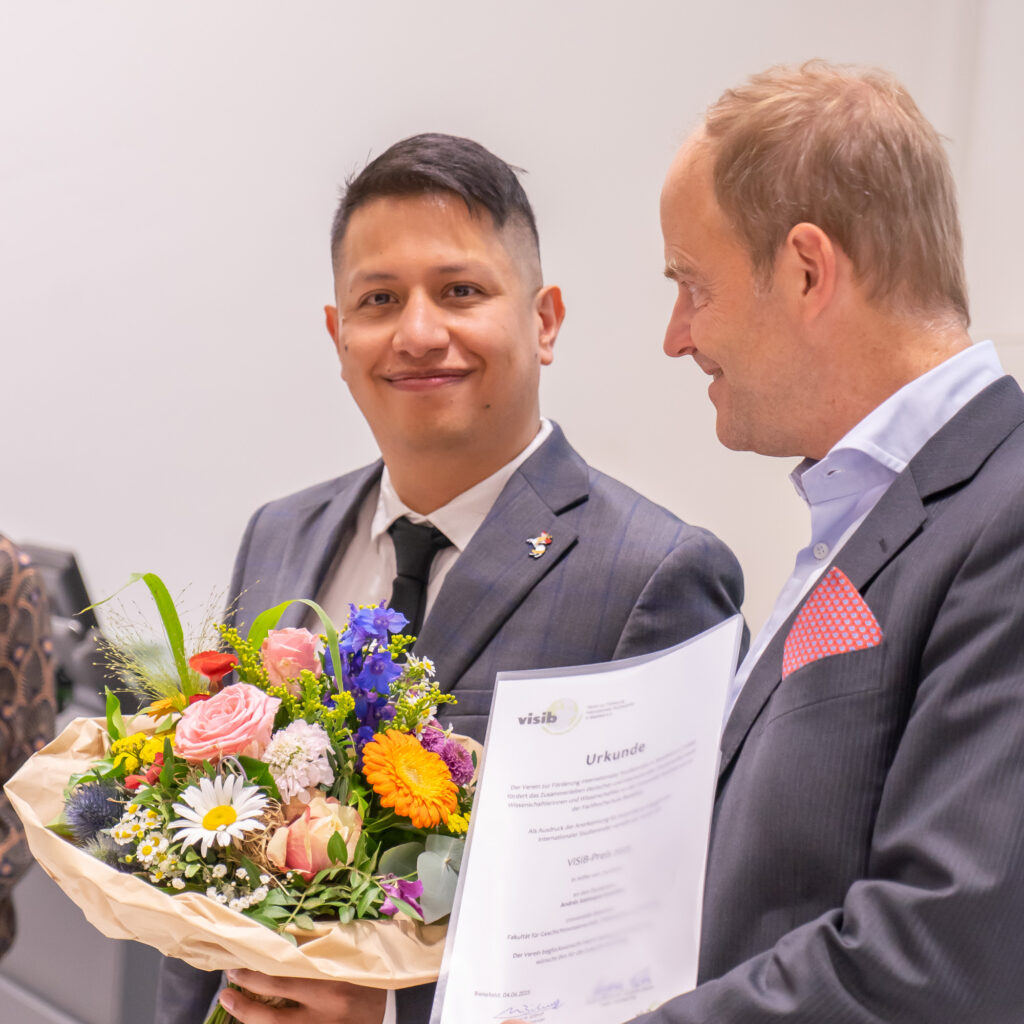 Die mit 750 Euro dotierten Preise wurden von Michael W. Böllhoff, geschäftsführender Gesellschafter der Böllhoff Gruppe und Vorsitzender von ViSiB, sowie Hannah Möhring vom International Office der HSBI überreicht: „Wir finden es besonders wichtig, neben den außergewöhnlichen Noten auch das persönliche Engagement der Preiträgerinnen und Preisträger zu ehren und ihre Umsicht sowie Einbringung in die Gemeinschaft durch die Verleihung des ViSiB-Preises im Namen aller Vereinsmitglieder zu würdigen“, so Böllhoff.