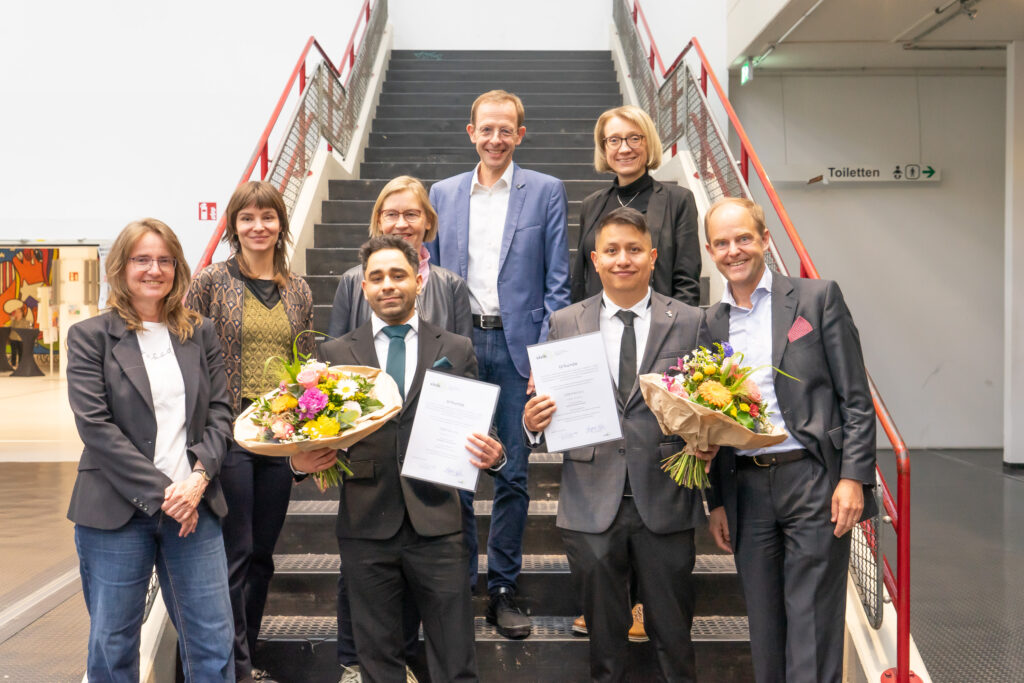 Die beiden Preisträger vorne in der Mitte (links Mohamed Tarek Dawalibi und rechts Andrés Sastoque González) mit den Laudatorinnen, Prof'in Dr. Michalea Vogt von der Universität, Prof. Dr. Ulrich Schäfermeier von der HSBI und Helga Fels vom Studierendenwerk,  Michael W. Böllhoff, geschäftsführender Gesellschafter der Böllhoff Gruppe und Vorsitzender von ViSiB.
