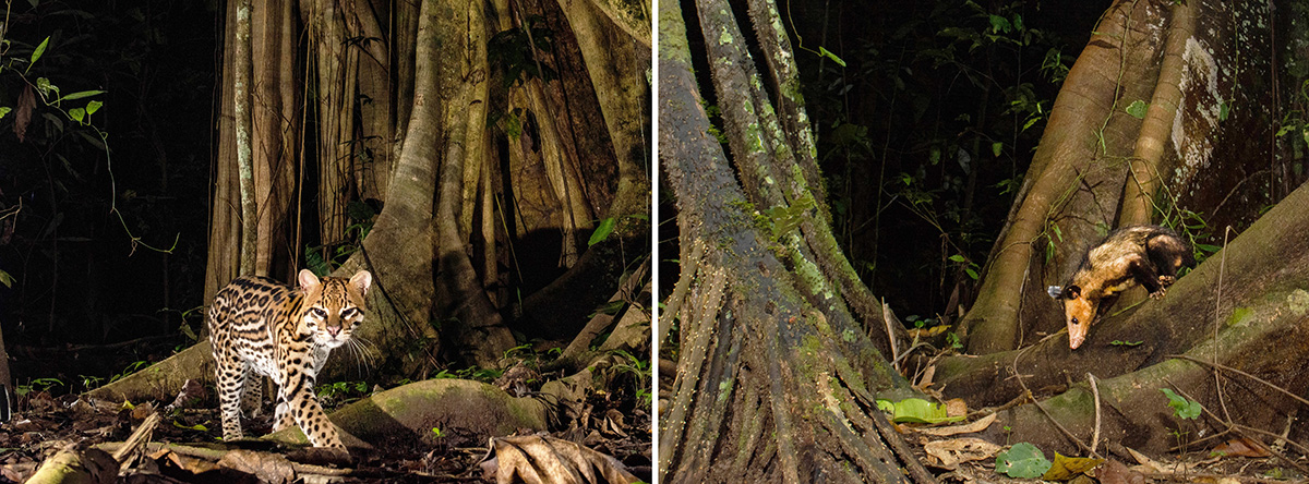 The ocelot (left) and the opossum are both at home in the rainforest. The researchers have now observed the unexpectedly friendly relationship.