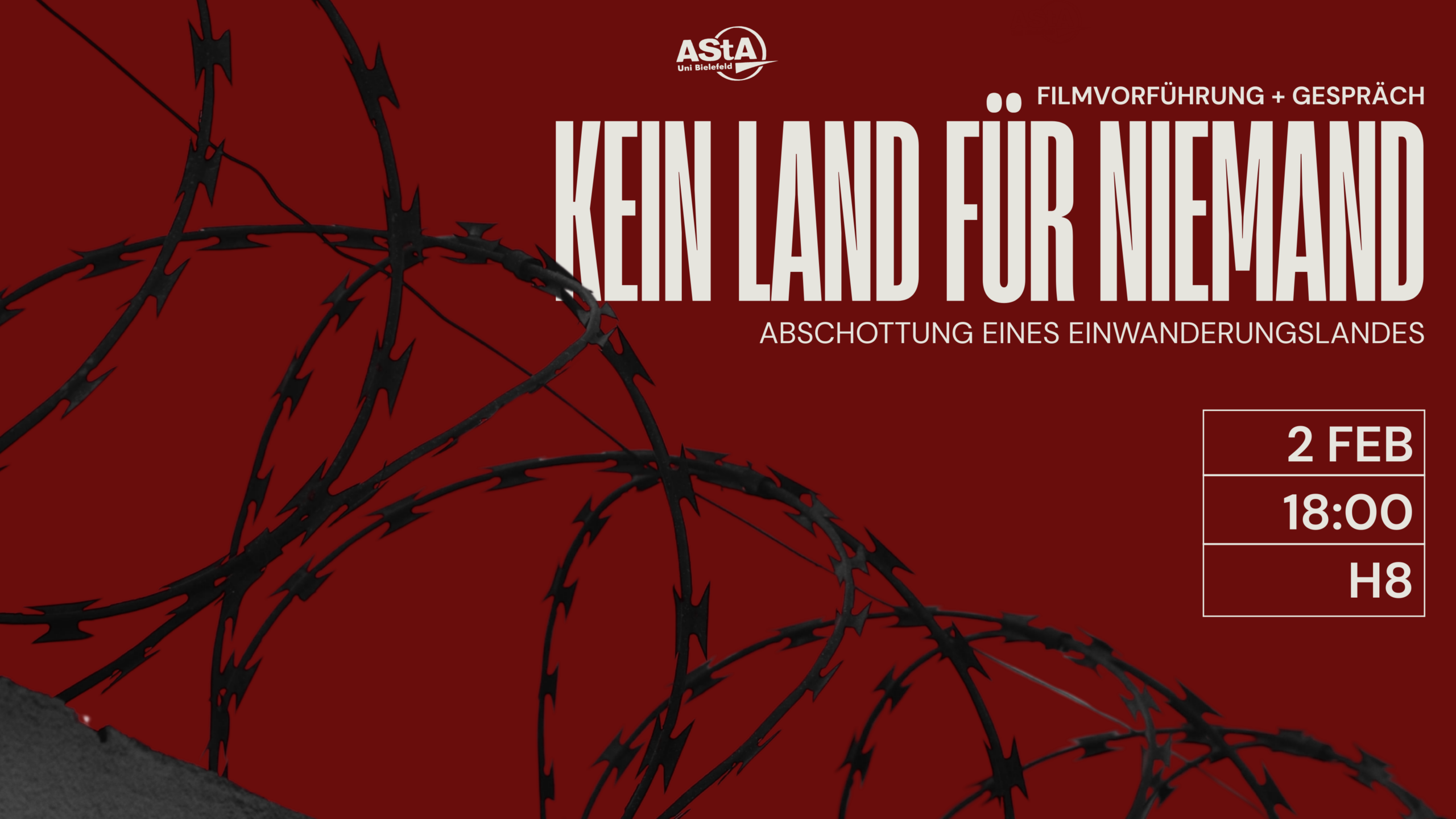 Wir zeigen die Doku Kein Land für Niemand: Abschottung eines Einwanderungslandes. Ein Film über Rechtsruck, Grenzpolitik und die Realität von Flucht. Danach: Gespräch und Diskussion mit einem der Filmemacher. Kommt vorbei und bringt eure Fragen mit! 📅 02.02.2026 🕕 18:00 Uhr 📍 H8, Uni Bielefeld