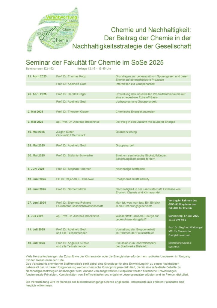 25.April 2025 Prof. Dr. Harald Gröger „Umstellung des industriellen Produktstammbaums auf eine erneuerbare Rohstoff-Basis“ und Prof. Dr. Adelheid Godt: Vorbesprechung Gruppenarbeit