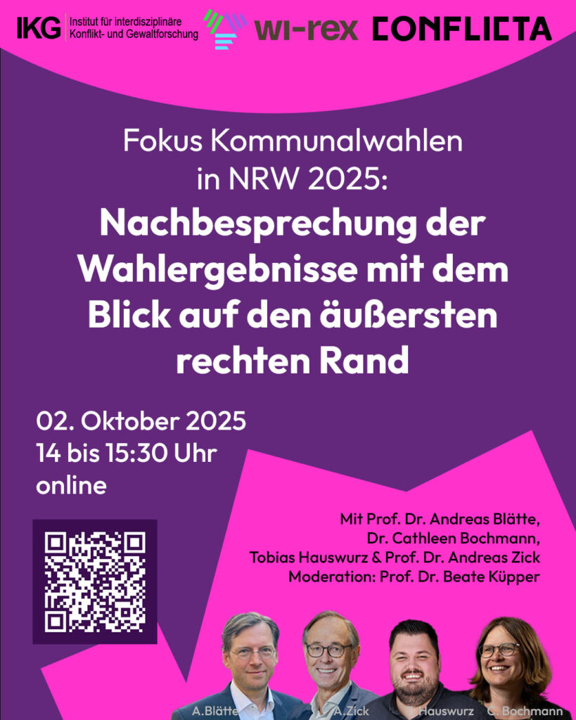 Aus diesem Anlass laden das Wissensnetzwerk Rechtsextremismusforschung (Wi-REX[1]) und die Konfliktakademie (ConflictA[2]) der Universität Bielefeld/ Institut für interdisziplinäre Konflikt-und Gewaltforschung (IKG[3]) am 2. Oktober 2025 von 14:00 bis 15:30 Uhr zu einer Online-Diskussionsrunde ein. Im Mittelpunkt stehen die Analyse und Einordnung der Wahlergebnisse mit besonderem Fokus auf den äußersten rechten Rand des politischen Spektrums. Darüber hinaus fragen wir nach den Erfahrungen aus dem Osten Deutschlands, um daraus Erkenntnisse für den Umgang mit einem möglichen Einzug von Parteien am rechten Rand in nordrhein-westfälische Kommunalparlamente zu gewinnen und geeignete Gegenstrategien zu diskutieren.
