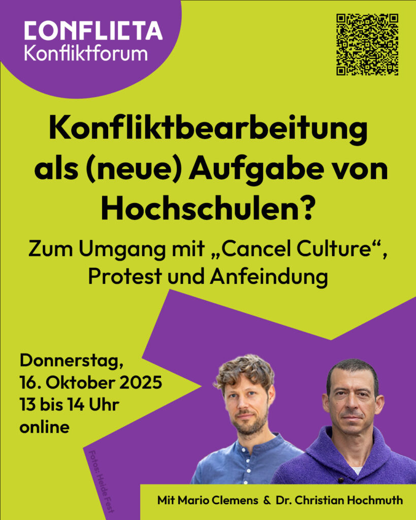 Wir laden Sie herzlich ein, mit unseren Gästen Mario Clemens und Dr. Christian Hochmuth Fälle zu diskutieren, in denen es an Hochschulen zu Spannungen zwischen dem Anspruch auf Meinungsfreiheit und dem Bedürfnis nach Schutz vor diskriminierenden Positionen kommt. Die Veranstaltung richtet sich an Hochschulangehörige aus Verwaltung, Forschung und Lehre sowie Fachkräfte im Bereich Beratung, Coaching und Konfliktmanagement – sowie alle, die sich für Konfliktbearbeitung an Hochschulen interessieren.