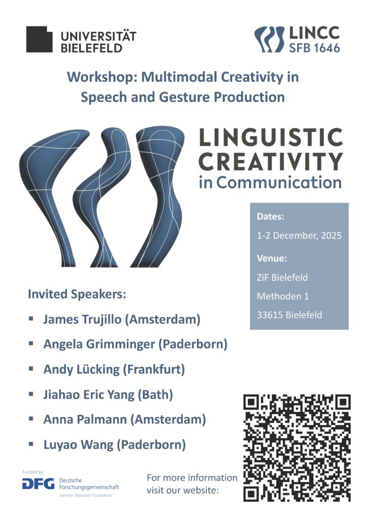 The workshop is organized by CRC 1646 Project C02. Its broad topic is how humans employ speech and gesture creatively in communicative challenging situations, e.g., when conventionalized or commonly used communicative resources are insufficient. The workshop will address empirical, conceptual as well as computational modelling challenges surrounding this question.