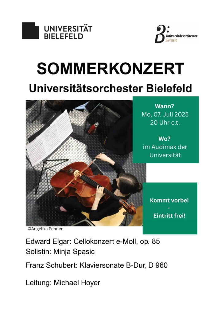 Es ist wieder soweit. Am Montag, den 07. Juli, wird um 20 Uhr im Audimax der Universität das Sommerkonzert des Universitätsorchesters stattfinden. Auf dem Programm stehen das Cellokonzert op. 85 von Edward Elgar und die von Michael Hoyer für Orchester bearbeiteten Sätze 1-3 von Schuberts Klaviersonate in B-Dur D 960. Als Solistin tritt die aus Slowenien stammende Minja Spasic erstmalig bei einem Konzert des Universitätsorchesters in Erscheinung. Sie ist nach ihrem Abschluss an der Detmolder Musikhochschule als freie Cellistin und Instrumentallehrerin tätig. Der Eintritt ist frei.