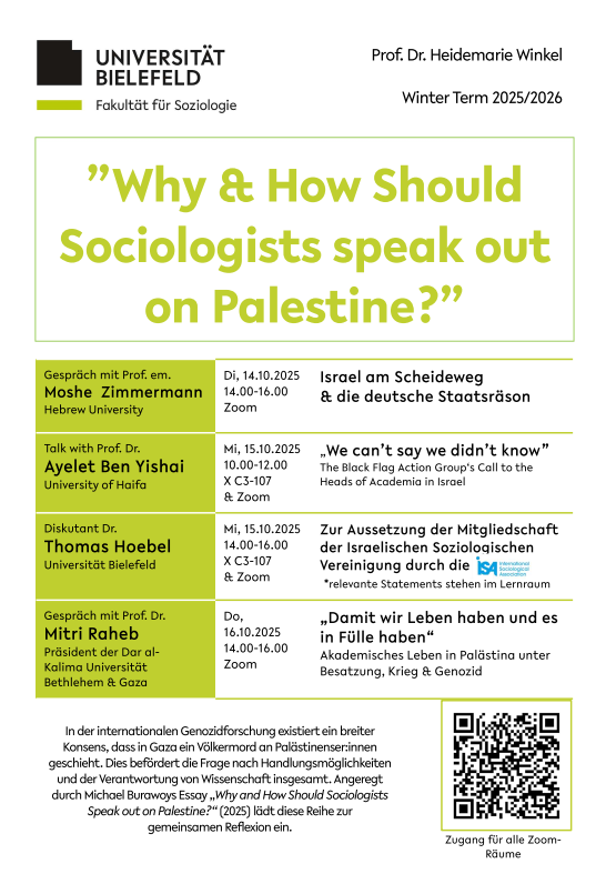 In der internationalen Genozidforschung existiert ein breiter Konsens, dass in Gaza ein Völkermord an Palästinenser:innen geschieht. Dies befördert die Frage nach Handlungsmöglichkeiten und der Verantwortung von Wissenschaft insgesamt. Angeregt durch Michael Burawoys Essay „Why and How Should Sociologists Speak out on Palestine?“ (2025) lädt diese Reihe zur gemeinsamen Reflexion ein.