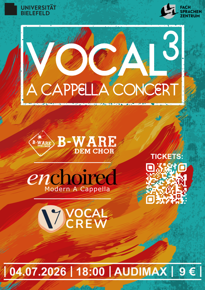 On July 4, 2026, the Audimax at Bielefeld University will become the stage for an A Cappella evening full of sound, energy, and truly live moments: featuring B-WARE | dem Chor, enchoired, and the Vocal Crew.